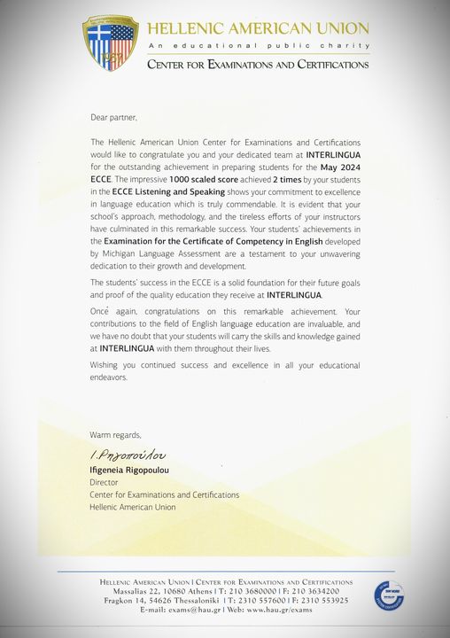 Το Κέντρο Εξετάσεων και Πιστοποιήσεων της Ελληνοαμερικανικής Ένωσης θα ήθελε να συγχαρεί εσάς και την αφοσιωμένη ομάδα σας στην INTERLINGUA για το εξαιρετικό επίτευγμα στην προετοιμασία των μαθητών για το ECCE του Μαΐου 2024. Η εντυπωσιακή βαθμολογία της κλίμακας 1.000 που πέτυχαν δύο φορές οι μαθητές σας στο ECCE Listening and Speaking δείχνει τη δέσμευσή σας για αριστεία στη γλωσσική εκπαίδευση, η οποία είναι πραγματικά αξιέπαινη. Είναι προφανές ότι η προσέγγιση του κέντρου σας, η μεθοδολογία και οι άοκνες προσπάθειες των εκπαιδευτών σας οδήγησαν σε αυτή την αξιοσημείωτη επιτυχία. Τα επιτεύγματα των μαθητών σας στις Εξετάσεις για τα Πιστοποιητικά Επάρκειας της Αγγλικής Γλώσσας που αναπτύχθηκαν από το Michigan Language Assessment αποτελούν απόδειξη της ακλόνητης αφοσίωσής σας στην ανάπτυξη και την εξέλιξή τους.